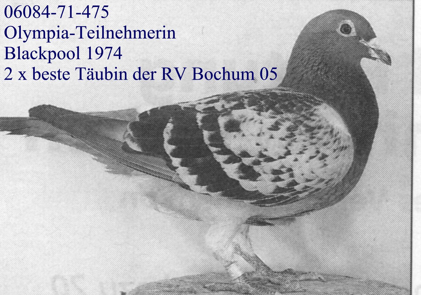 Die 06084-71-475 w geh. stammt aus der alten G. u. V. Fabry, Lüttich Linie. Die 06084-71-475 w geh. ist die Großmutter der 06084-81-46 w rot (8. AS-Täubin BRD 1984).